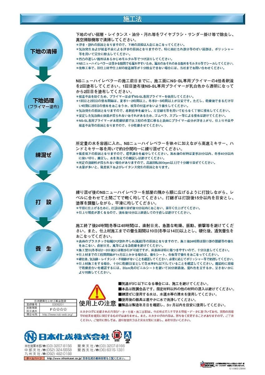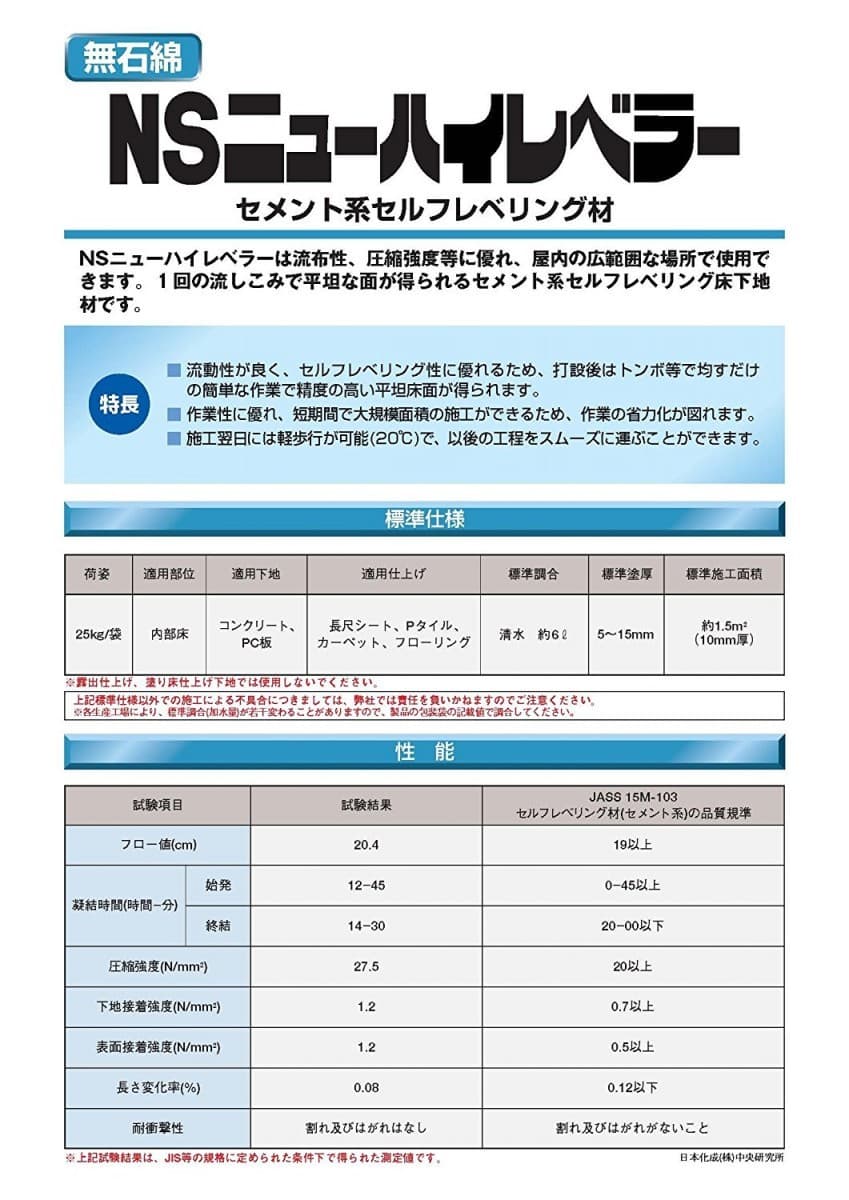 - ・NSニューハイレベラーは、セメント系セルフレベリング材です。