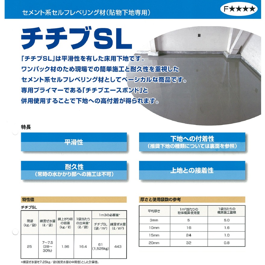 チチブSLは、張り物下地専用のセメント系セルフレベリング床下地材です。
