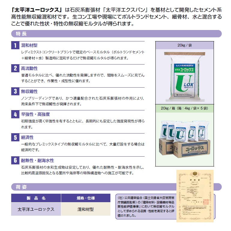 太平洋ユーロックス 20kg(4kg×5袋)箱 セメント系無収縮材(混和材型) 太平洋マテリアル【法人様限定】