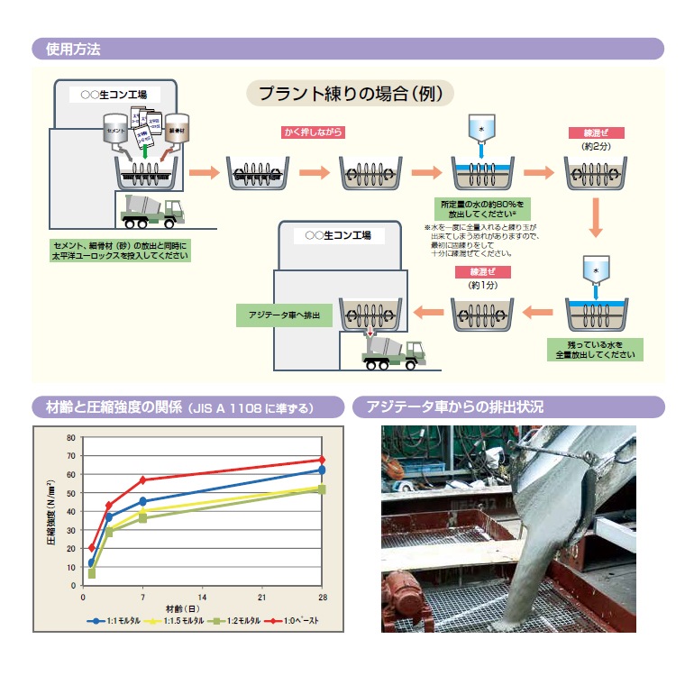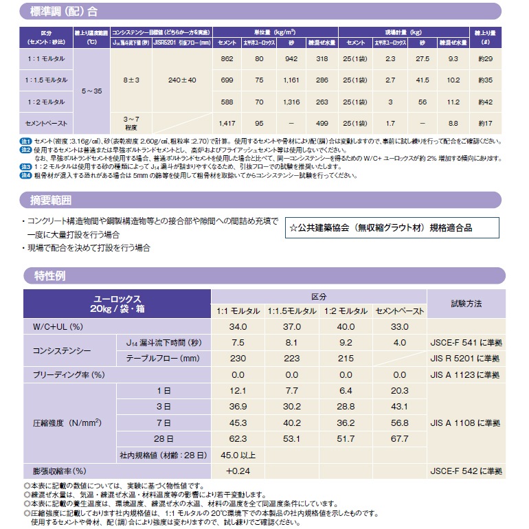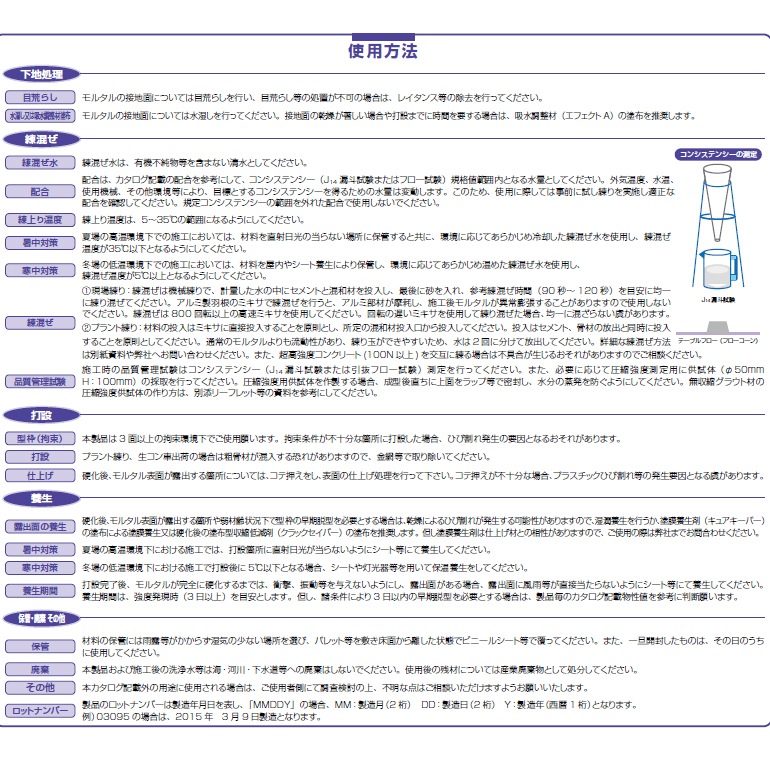 ・混和材型のため、現場、生コン工場でセメント、細骨材と混合することで無収縮モルタルを得ることが可能です。