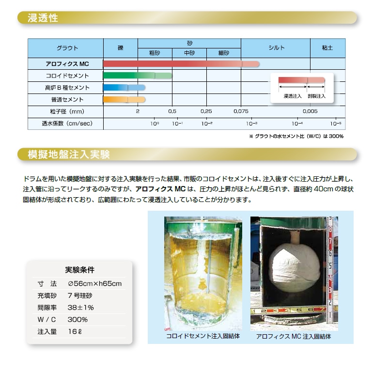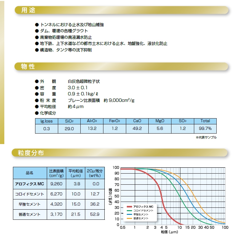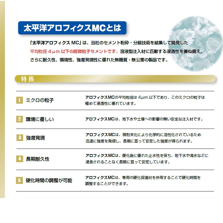 平均粒径4μm、ブレーン9,000平方センチメートル/g以上の超微粒子セメントで、地盤への浸透性に極めて優れています。